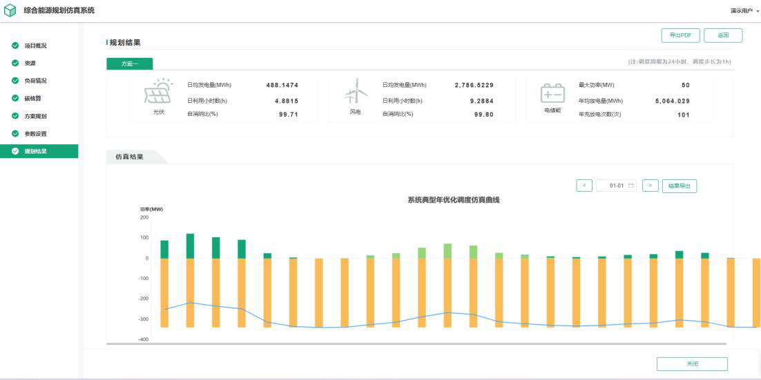 平臺是一套面向雙碳目標的源-網-荷-儲協同全景電力規劃和模擬仿真系統,實現了綜合能源多目標優化算法、長時間尺度仿真模型、綜合能源經濟評價等多重模型仿真,確定以用能成本最低、平準化度電成本最低、碳排懲罰最小以及系統建設經濟性最優為目標的多目標優化調度策略,為實現雙碳場景下的數字化咨詢業務提供技術和軟件支撐。